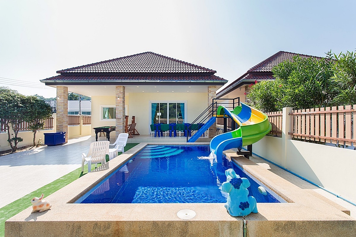 บ้านดั่งฝัน หัวหิน พูลวิลล่า บ้านพักบรรยากาศร่มรื่นมีขนาด 4 ห้องนอน 2 ห้องน้ำ มีสระว่ายน้ำส่วนตัว ขนาด 4×7 เมตร ลึก 1.4 – 1.6 เมตร (ไล่ระดับ) สไลเดอร์ ยาว 5 เมตร รองรับผู้เข้าพักได้ 12 ท่าน เสริมได้ 8 ท่าน ติดแอร์ทั้งหลัง ตั้งอยู่ หัวหินซอย 102 มีโต๊ะสนุ๊กให้ได้เล่นกันอย่างสนุกสนาน เพลิดเพลินไปกับเสียงเพลงคาราโอเกะ + ไฟเธค ตลอดการเข้าพัก สามารถประกอบอาหารได้ อุปกรณ์ครัวครบ มีเตาปิ้งย่าง บริการ