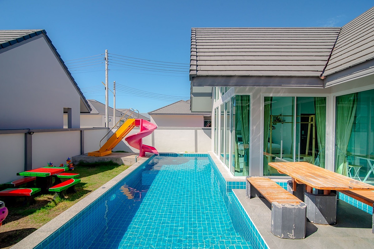 บ้านดีไซน์ ชะอำ พูลวิลล่า บ้านพักที่ สามารถขับรถไปทะเล 10-15 นาที ตั้งอยู่ ชะอำ มาพร้อมกับ ความเป็นส่วนตัว ภายในบ้านพักประกอบด้วย 4 ห้องนอน 3 ห้องน้ำ มีคาราโอเกะ +ไฟเธค บริเวณ ห้องรับแขก สร้างความบันเทิงให้กับผู้เข้าพัก สามารถประกอบอาหารได้ มีอุปกรณ์ครัวครบ เตาปิ้งย่าง พร้อมสำหรับ ย่างอาหารทะเล รองรับผู้เข้าพักได้ 15 ท่าน เท่านั้น เสริมไม่ได้ ติดเครื่องปรับอากาศทั้งหลัง ภายนอกบ้านพักมี สระว่ายน้ำส่วนตัว สำหรับ ผ่อนคลาย มี สไลเดอร์ ริมสระ เพิ่มความสนุก ตลอดเวลาเข้าพัก