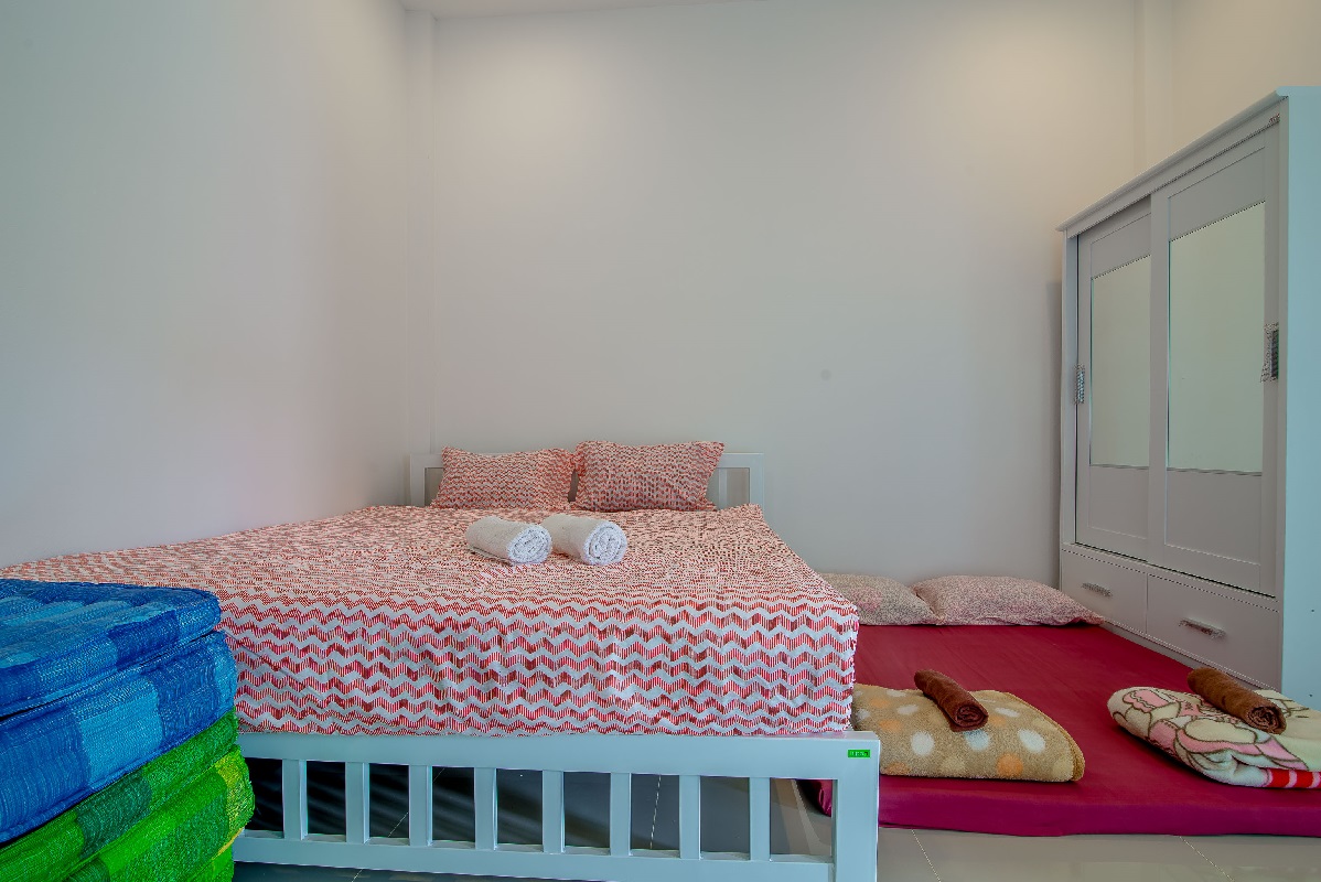 • บ้านพักมี เตียง 6 ฟุต 3 เตียง และ ที่นอนเสริมตามจำนวนคนเข้าพัก